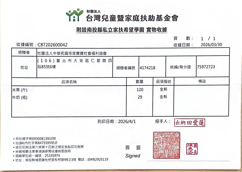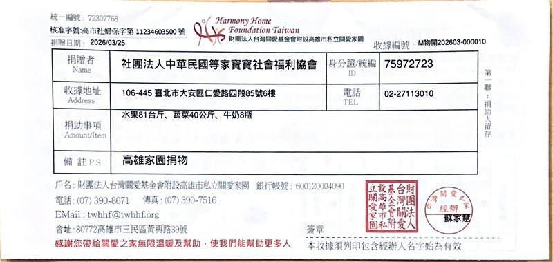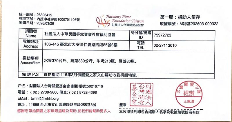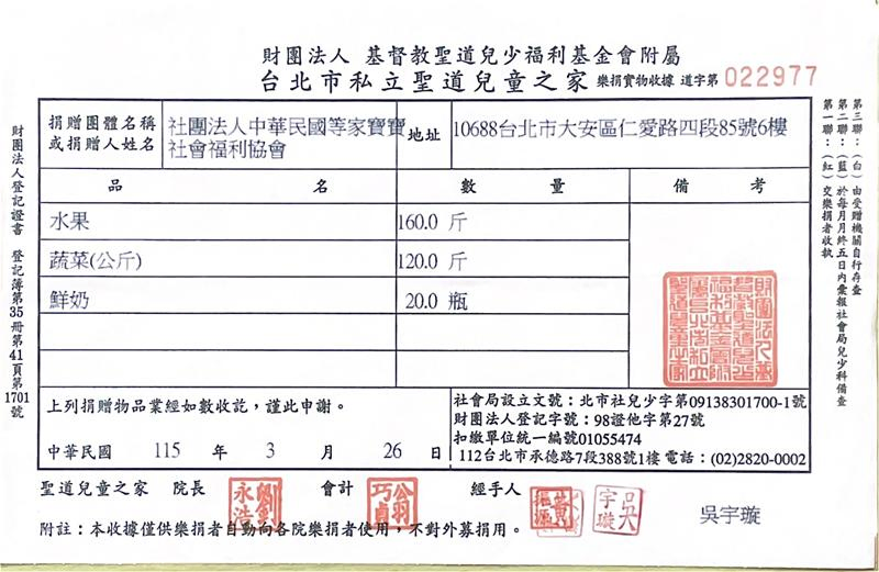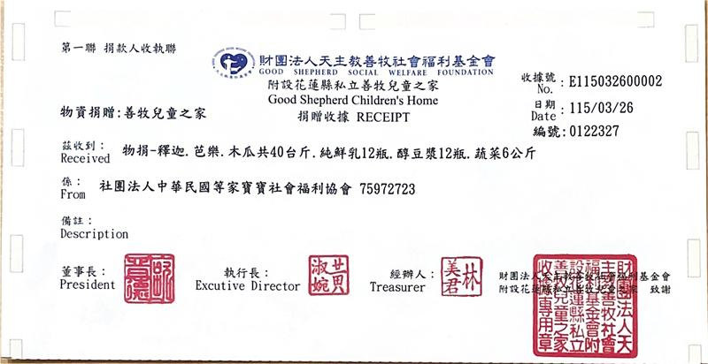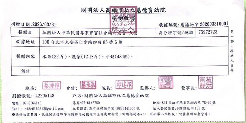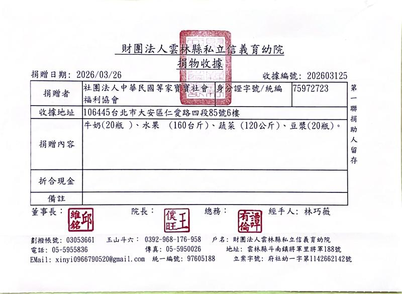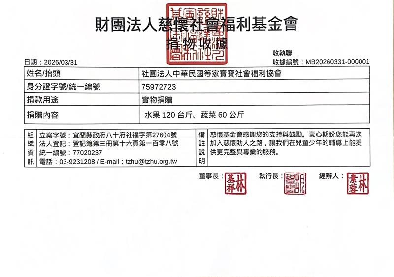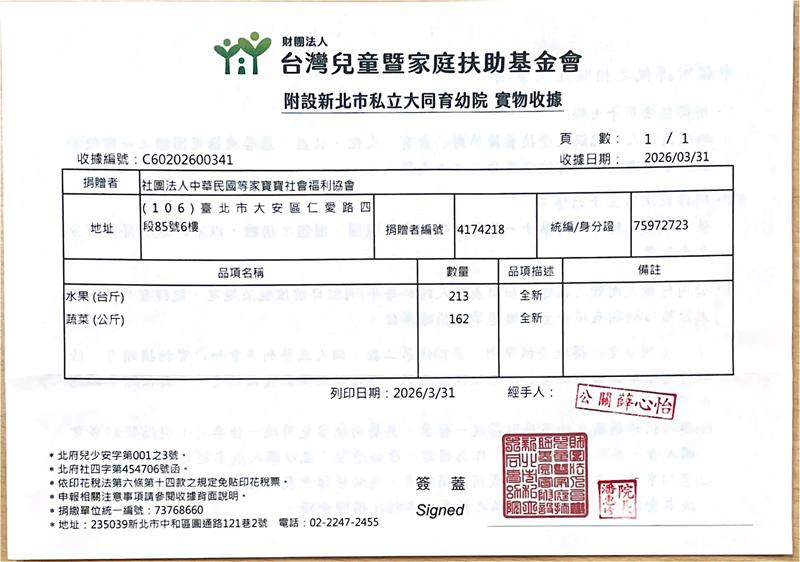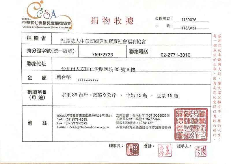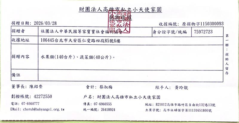 感謝每一位贊助者,您的每一份愛心我們都確實送達到育幼院囉!~邀請您與我們一起用新鮮蔬果、牛奶及豆漿陪伴等家寶寶健康地長大,用愛心豐富孩子們的童年😊