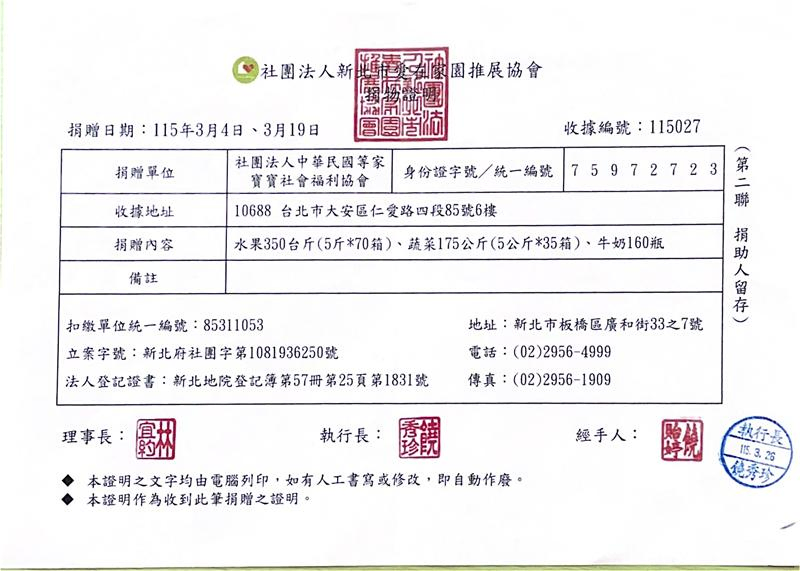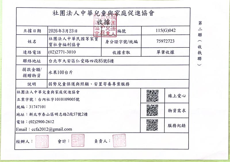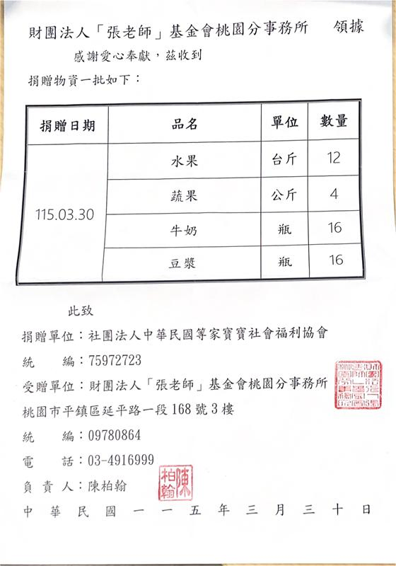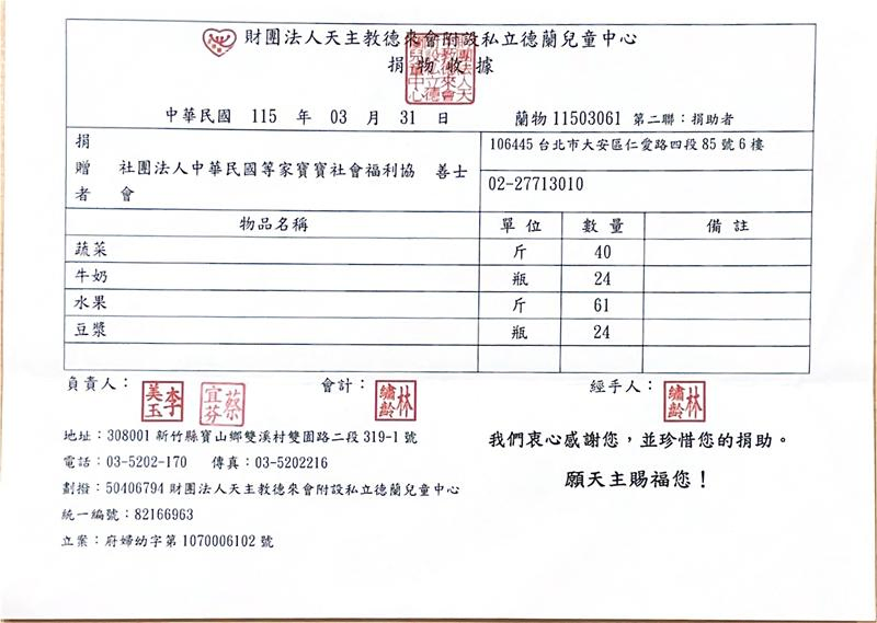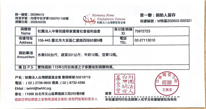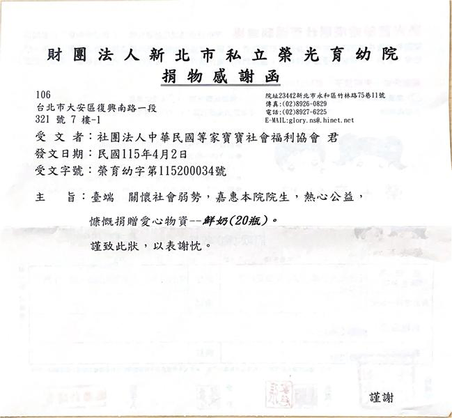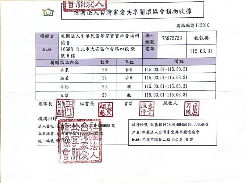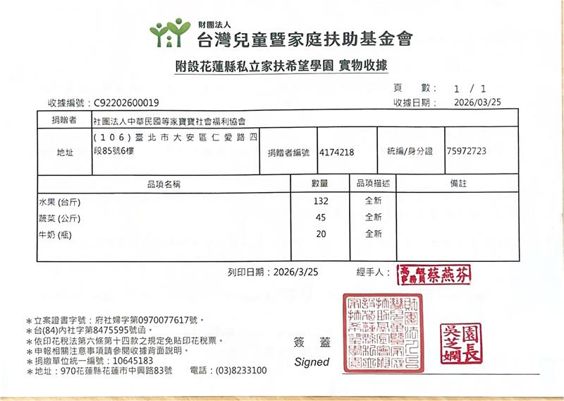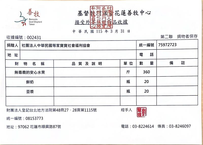 感謝每一位贊助者,您的每一份愛心我們都確實送達到育幼院囉!~邀請您與我們一起用新鮮蔬果、牛奶及豆漿陪伴等家寶寶健康地長大,用愛心豐富孩子們的童年😊